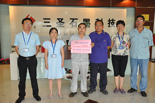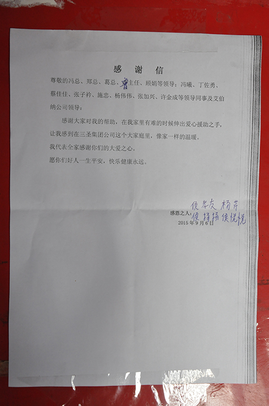 四、 董事長親自捐贈(zèng)善款救助聽到侯孝友的實(shí)際困難匯報(bào)后,董事長非常關(guān)心,立即拿出私人款2000元現(xiàn)金資助,幫助侯孝友度過暫時(shí)的難關(guān)。鄭董還親自接待了侯孝友,詳細(xì)了解了他家庭目前的狀況,鼓勵(lì)他樹立信心,克服暫時(shí)困難,及時(shí)幫助妻子治療,引導(dǎo)兒女安心學(xué)習(xí),同時(shí),希望他在公司本職工作中繼續(xù)發(fā)揚(yáng)不拍苦、腳踏實(shí)地的精神,積極專研技能,不要辜負(fù)三圣愛心傳遞的希望。