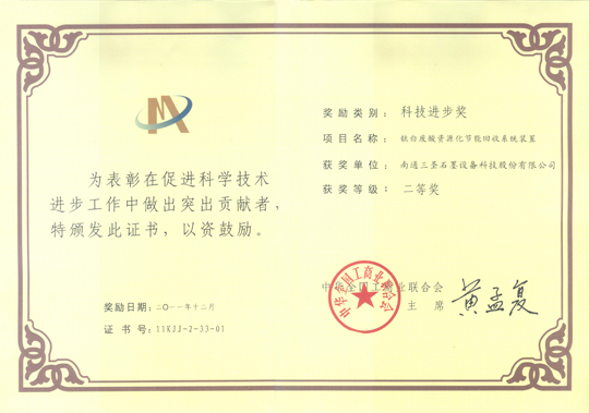 日前,從全國工商聯(lián)十屆五次執(zhí)委會議傳來佳音,南通三圣“鈦白鈦白廢酸資源化節(jié)能回收系統(tǒng)裝置”榮獲“2011年中華全國工商業(yè)聯(lián)合會科技進步二等獎”。